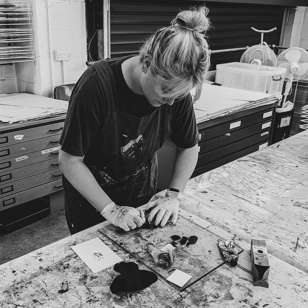 She has recently completed her Fine Art degree at Chichester University and is excited to incorporate more printmaking into her practice. In her spare time, she enjoys listening to True Crime podcasts and going on walks with her 4 dogs.
