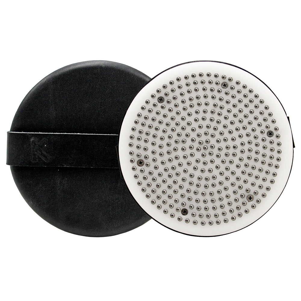 This ball bearing baren allows you to handprint various types of relief printing and monotypes to any scale. The baren is made from a disc of high-grade plastic, allowing them to form pressure points for printing. This allows the balls to rotate freely in use which delivers multiple pressure points evenly across the disc. The baren is bound in black leather with a strong leather handle.