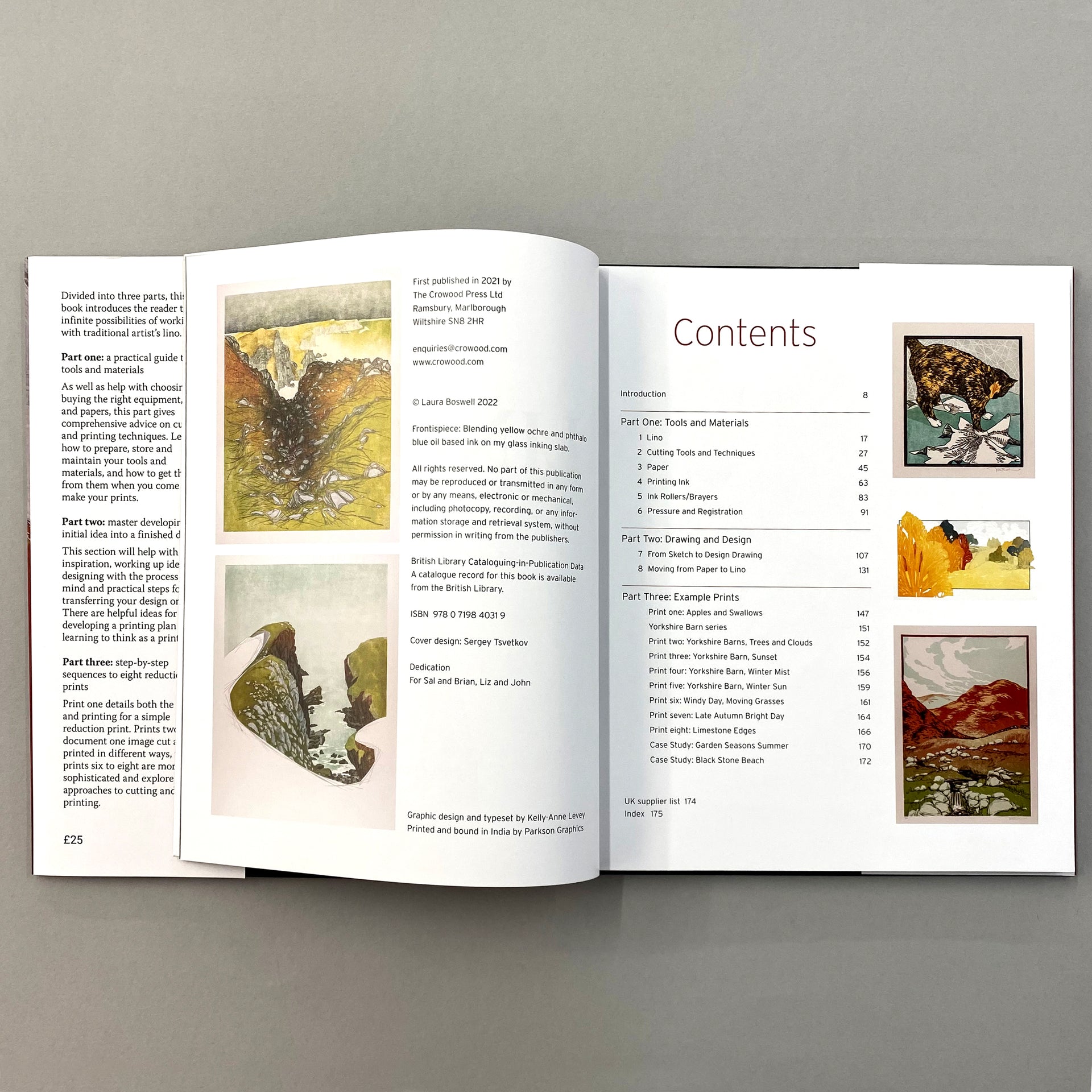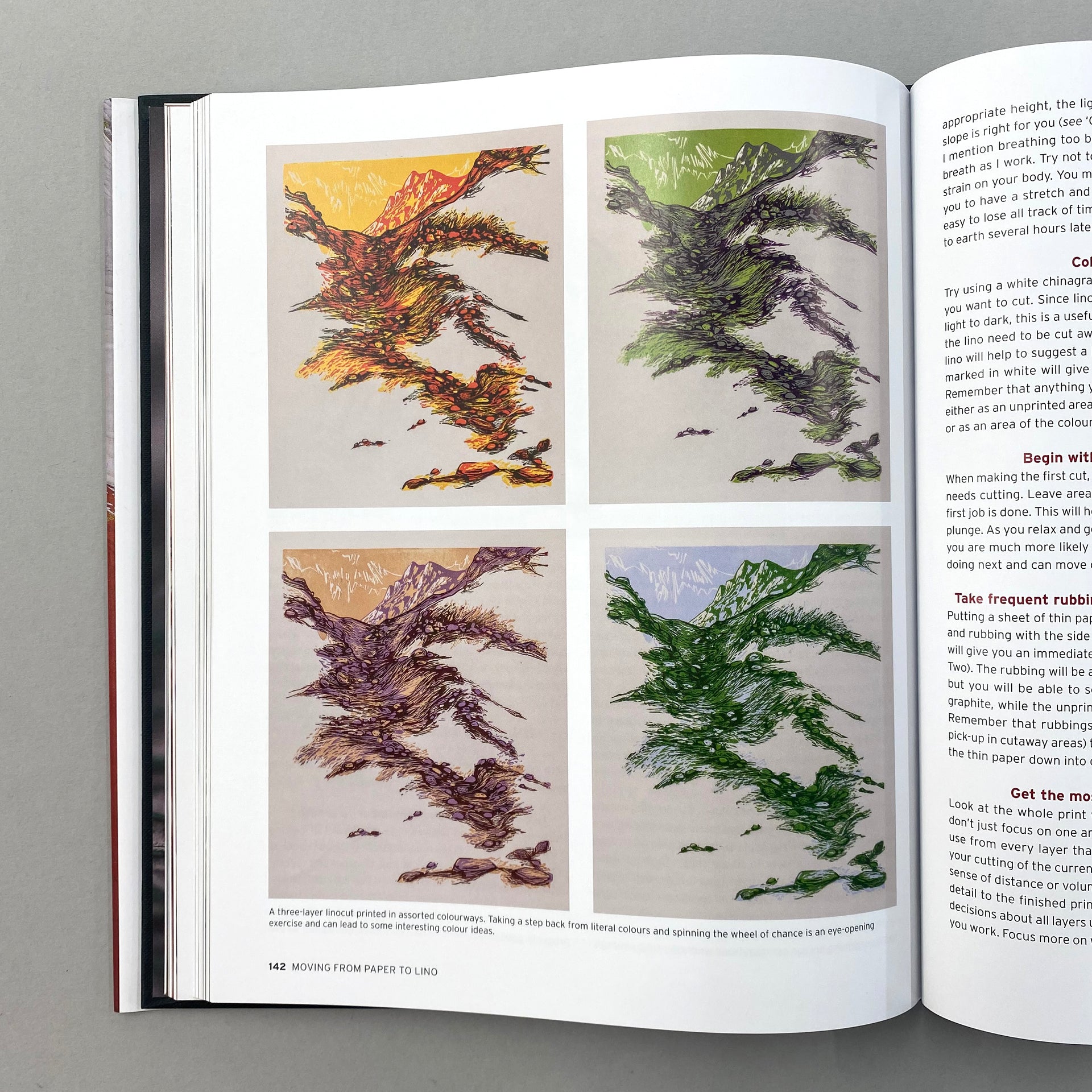 Divided into three parts, this book introduces the reader to the infinite possibilities of working with traditional artist’s lino. Explains the tools and materials you’ll need, as well as vital techniques such as sharpening your tools and installing a printing press. There is instruction on how to draft a design and transfer it to lino, ready for cutting and printing. Finally, there are step-by-step sequences to ten different prints, broken down into layers and showing the build-up of colours.