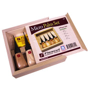 Can be used for carving both wood and lino. The comfortable handles sit against the heel of your hand. This set of four palm tools comes in a wooden box with a sliding lid. This set is designed for carving very fine detail.