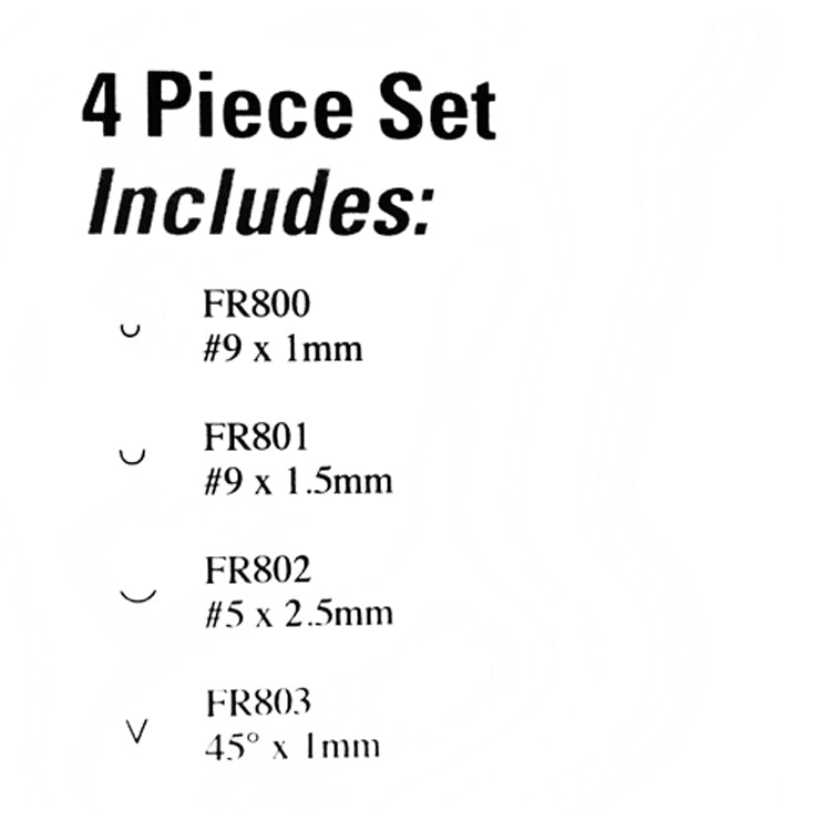 Set includes FR802 #5 x 2.5 mm, FR800 #9 x 1mm, FR801 #9 x 1.5mm, FR803 45 deg. x 1mm.