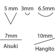 Set contains 5 Woodcut/Lino tools: 5mm V tool, 3mm U, 6.5mm U, 7mm Aisuki (for clearing wood you do not want to pick up ink) and 10mm Hangito (for scoring edges of designs).