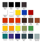 Charcoal Black, Dense Black, Extra Dense Black, Brown Shade Black, Opaque White, Transparent, Process Yellow, Process Cyan, Process Magenta, Cadmium Deep Red Hue, Crimson, Warm Scarlet (Opaque), Burnt Umber, Raw Umber, Raw Sienna, Cadmium Yellow Light Hue, Cadmium Yellow Medium Hue, Lemon Yellow, Chartreuse (Opaque), Light Green, Turquoise, French Blue, Ultramarine Blue, Prussian Blue, Indigo, Peter Wray's Light Grey (Opaque) Patrick's Winter Grey, Willow (Opaque).