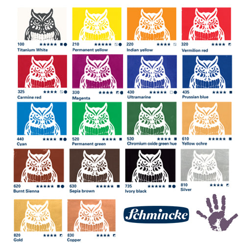- Opaque: Titanium White, Prussian Blue, Cyan, Permanent Green, Chromium Oxide Hue, Yellow Ochre, Burnt Sienna, Sepia Brown, Black
