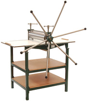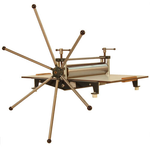 The spokes from the wheel are made of stainless steel pipe. If the spindles are loosened, the upper roller is raised by spring pressure. This makes presses ideally suited for lino and woodcut as well as intaglio printing. A pile of leather or cardboard can be placed under the spindles, thus providing more flexibility during printing. The upper roller has self lubricating bronze glide bearings and the lower roller ball bearings. The star wheel can be dismantled.