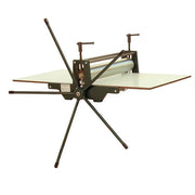 The relatively small size of this press and the fact that the rollers are provided with ball bearings makes a gearing system unnecessary. The hard synthetic plate is guided on both sides by the solid steel frame. If the spindles are loosened the upper roller is raised by spring pressure. This results in a space appearing between the upper roller and the bed plate thus facilitating the sliding of the printing sandwich. The printing of lino and wood cuts is also possible because of the above mentioned spring pressure. It is possible to dismantle the star wheel which is secured with a key joint. Shims of leather or cardboard can be placed under the spindles thus providing more flexibility during printing. (useful while printing woodcuts that are not quite plane).