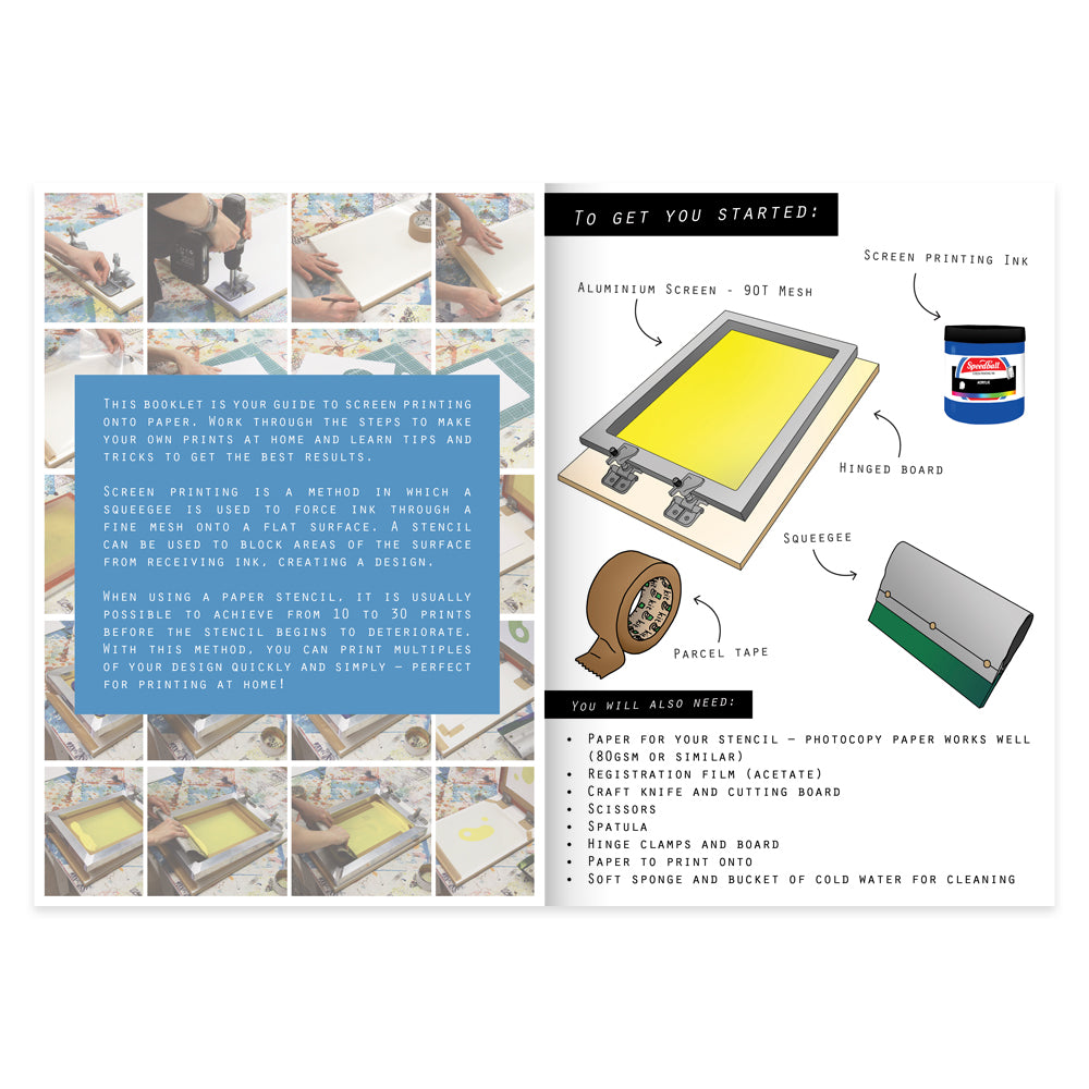 This booklet is your guide to screen printing onto paper. Work through the steps to make your own prints at home and learn tips and tricks to get the best results.