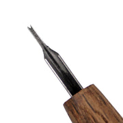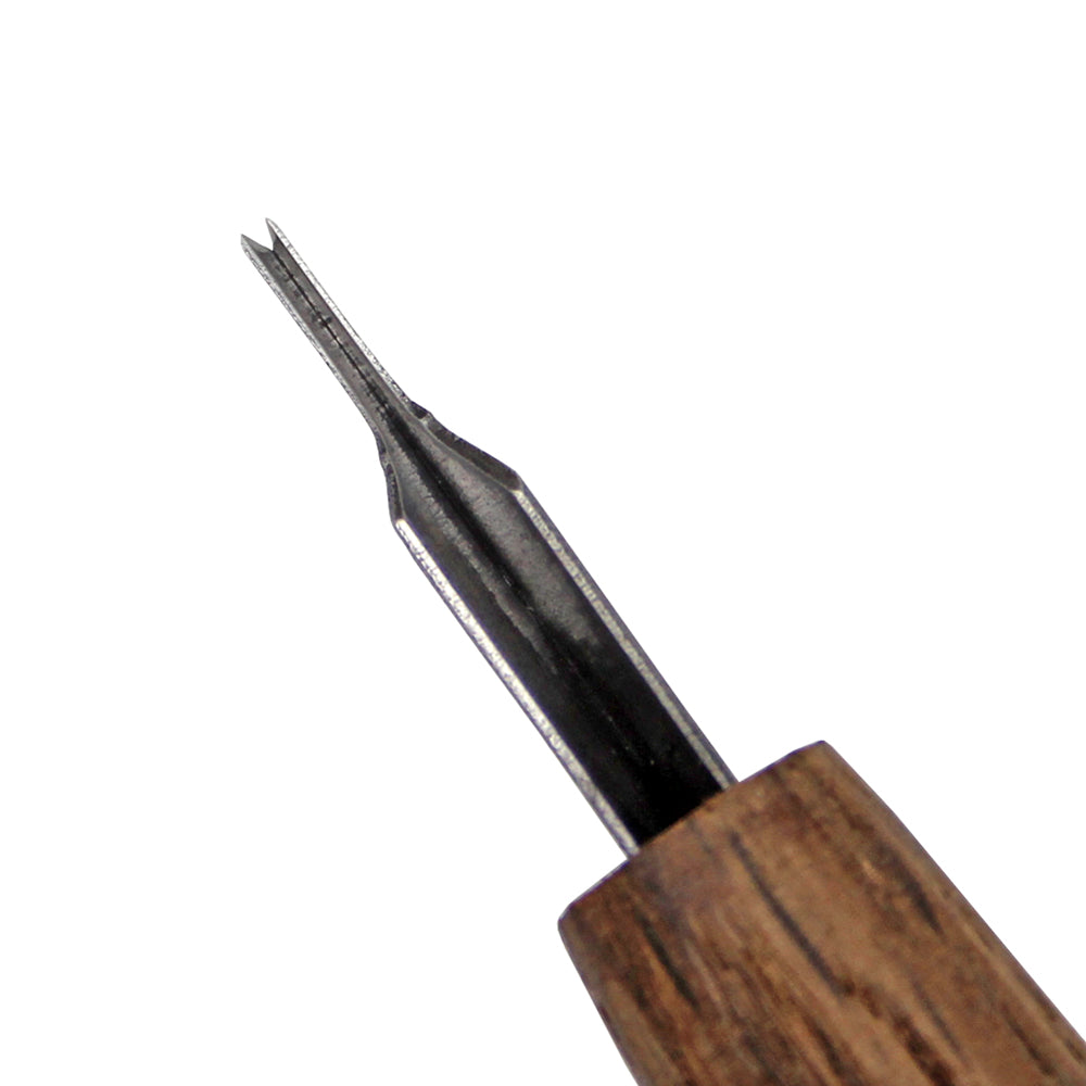 Incredibly fine, sharp tool for tiny details. 0.5mm V shape with a High-Speed Steel Blade and Smoked Oak Handle. Perfect for Lino or Wood. Take care when using this tool as the blade is very delicate.