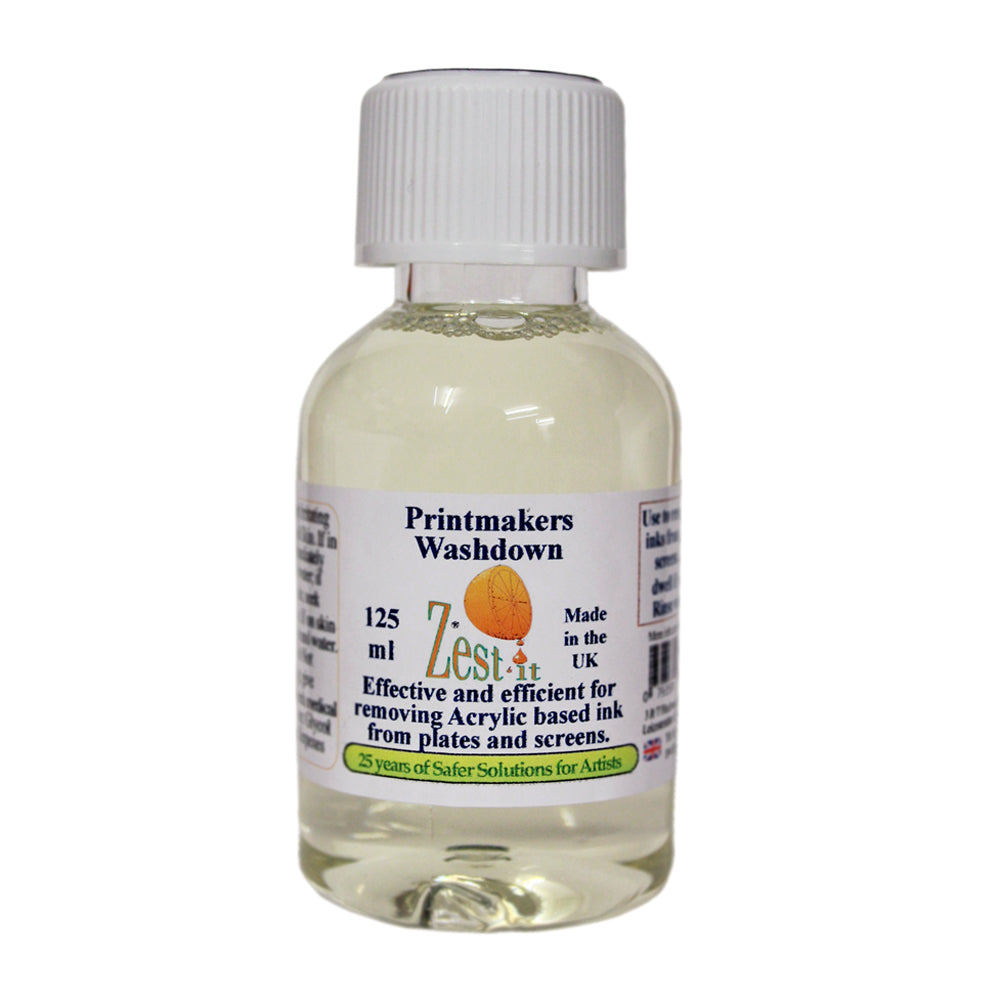 A more environmentally friendly, non-flammable, pleasant to use, biodegradable solution made using the zest of citrus fruit. For removing dried on acrylics, dried acrylic inks from screens (may remove emulsion from exposed screens) and removing dried water-based inks from rollers and inking plates. A much safer solvent for studio use. Perfect for cleaning up acrylic-based printing inks.